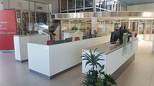 De (werkplaats)receptie bestaat uit 2 delen. Het voorste deel is bedoeld voor het directe een-op-een contact met al onze klanten en bezoekers. Hier wordt u te woord gestaan, ontvangt u de sleutels van uw auto terug na onderhoud en word een factuur samen met u bekeken. De voorste balie is een sta-balie en bevat daarom ook geen zitmeubilair. De achterste balie is de plaats waar onze collega's hun werkzaamheden uitvoeren, maar wel nog altijd zicht hebben op iedereen die de showroom binnenkomt.