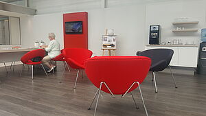 De wachtruimte is voorzien van een grote tafel om aan te werken, inclusief stopcontacten en stoelen waarin u als klant makkelijker kunt zitten. Ook is er een losse zithoek met loungestoelen als u even niet aan werken wilt denken.